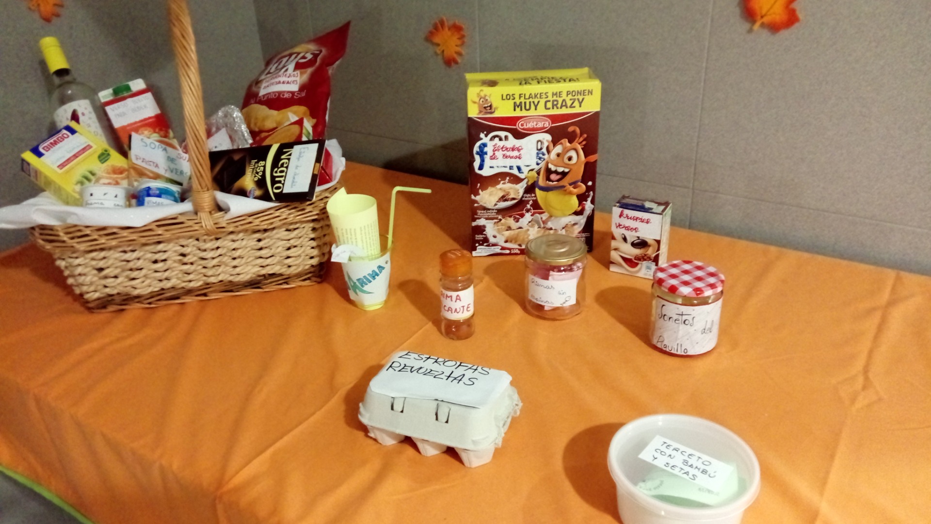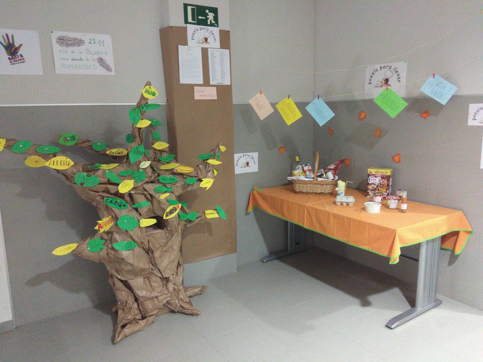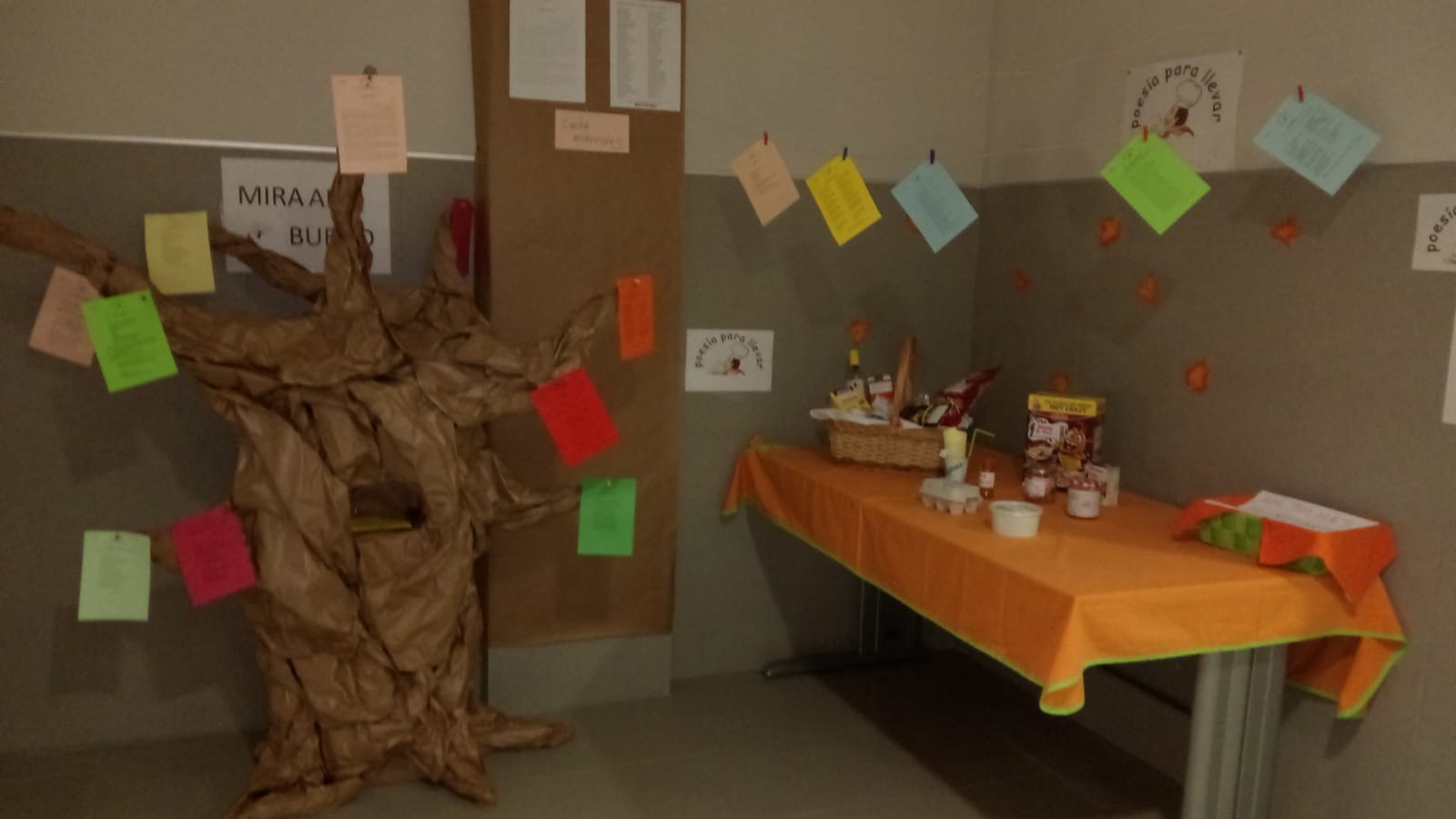 Para hacer más atractiva la actividad, sea "poesía para llevar" y degustar, alumnos y profesores hemos preparado nuestra cesta de mimbre repleta de platos poéticos ricos en una mesa que ha ido cambiando de decoración para adaptarse a las fechas que iban sucediéndose. En las fotos puede verse con decoración otoñal y después con la correspondiente a la festividad de difuntos/Halloween.